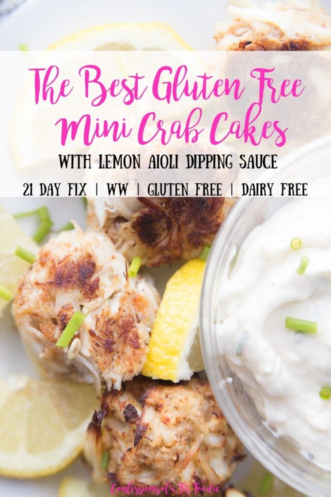 A plate of mini gluten free crab cake appetizers garnished with chives, lemon slices and sitting next to a lemon aioli dipping sauce